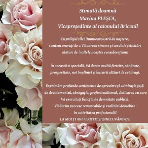 Mesaj de felicitare adresat doamnei Marina PLEȘCA, Vicepreședinte al raionului Briceni cu ocazia Zilei de Naștere!